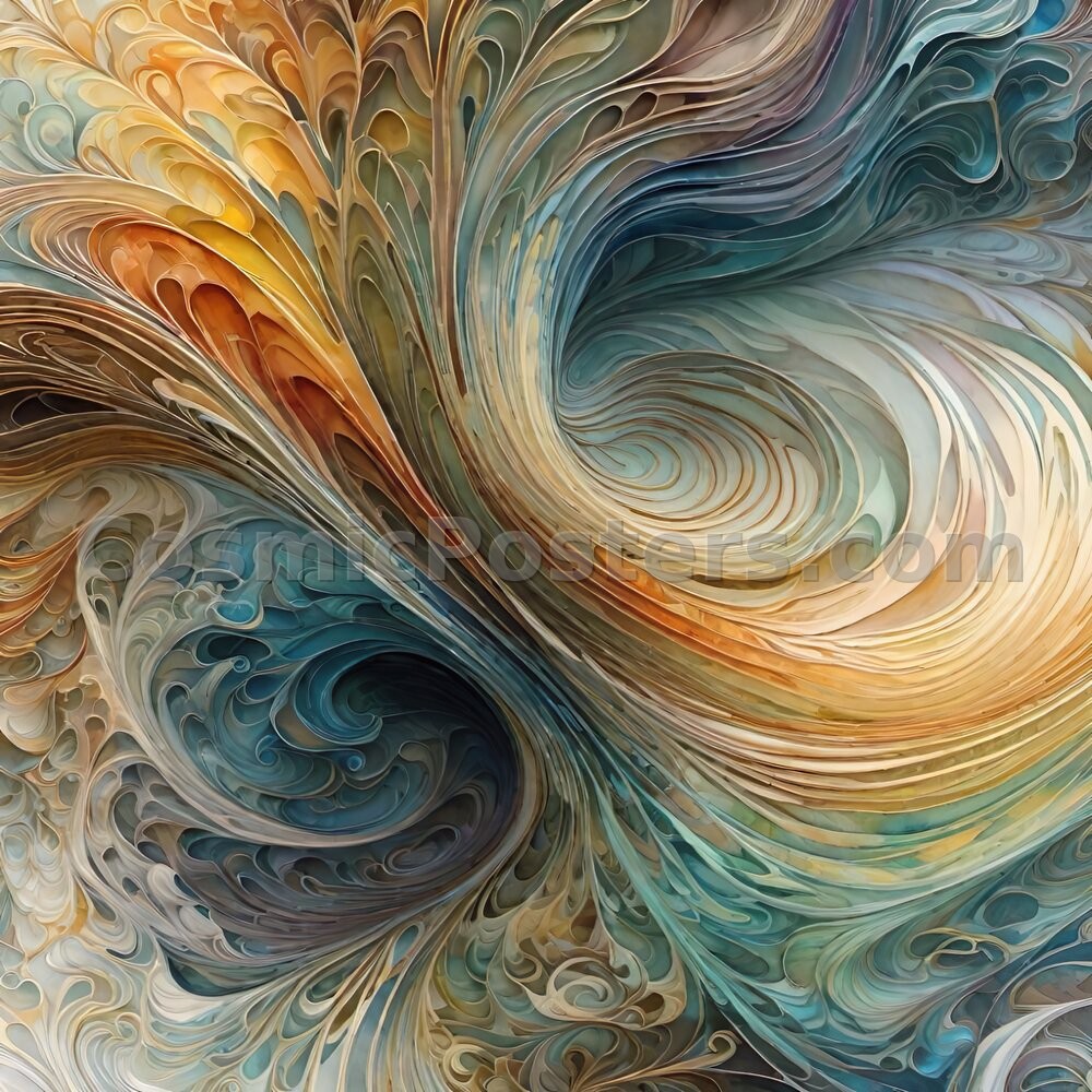 Immerse yourself in the captivating swirls of “Chromatic Current 34,” where vibrant hues twist and turn in a graceful ballet. This digital artwork draws inspiration from the fluidity of abstract expressionism, with its sweeping arcs and intricate patterns. The interplay of warm golds, cool blues, and earthy tones creates a dynamic composition that feels both soothing and invigorating.