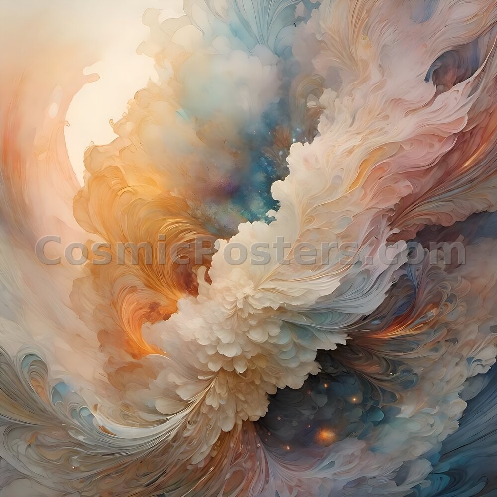 Immerse yourself in the swirling elegance of “Chromatic Current 48,” a digital masterpiece where soft amber and gentle blues collide in a harmonious dance. The artwork feels like a dreamscape, capturing the essence of a serene sunrise meeting the calm of twilight. Its fluid, organic forms evoke the gentle flow of natural elements, reminiscent of the Impressionist movement’s focus on light and color.