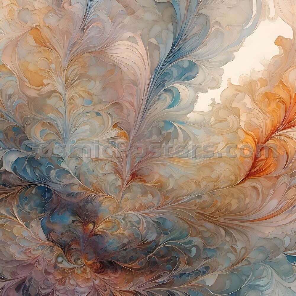 Discover the enchanting beauty of “Chromatic Current 53,” a digital artwork that captures the fluidity and grace of swirling colors in perfect harmony. This piece evokes the gentle flow of nature with its intricate feather-like patterns, blending warm oranges and earthy browns with cool blues and soft creams. The gentle curves and organic forms invite the viewer to explore the depth and movement within, offering a serene escape from the everyday.