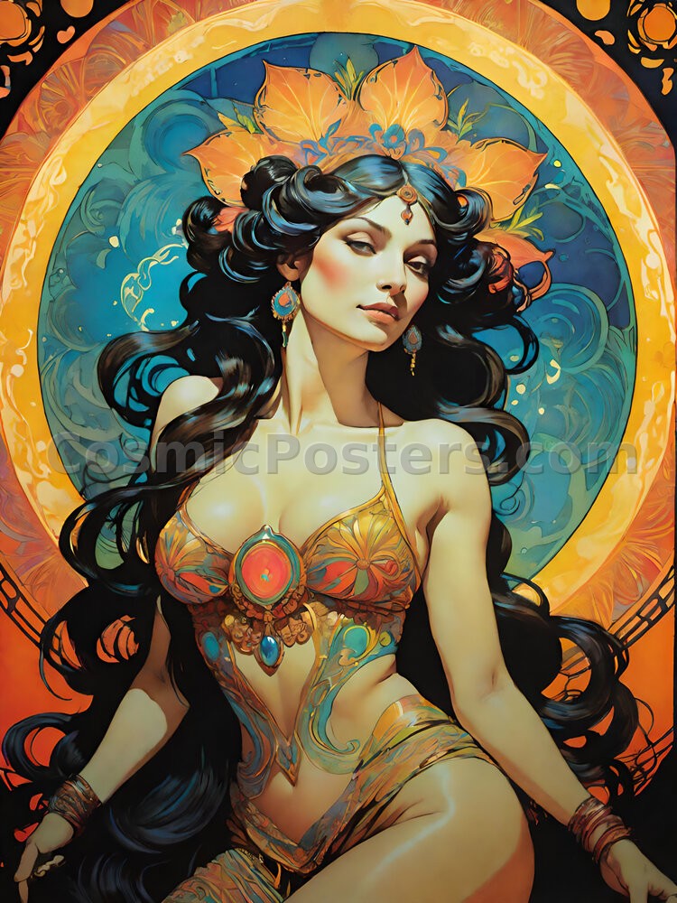 The luminous design is reminiscent of vintage poster art, with a contemporary twist that brings it to life in today’s spaces. Whether it’s a cozy reading nook, a chic home office, or an inviting living room, Gilded Reverie 19 transforms any space into a sanctuary of style and grace. Its vibrant colors and elaborate details reward close viewing, inviting onlookers to lose themselves in its depths.