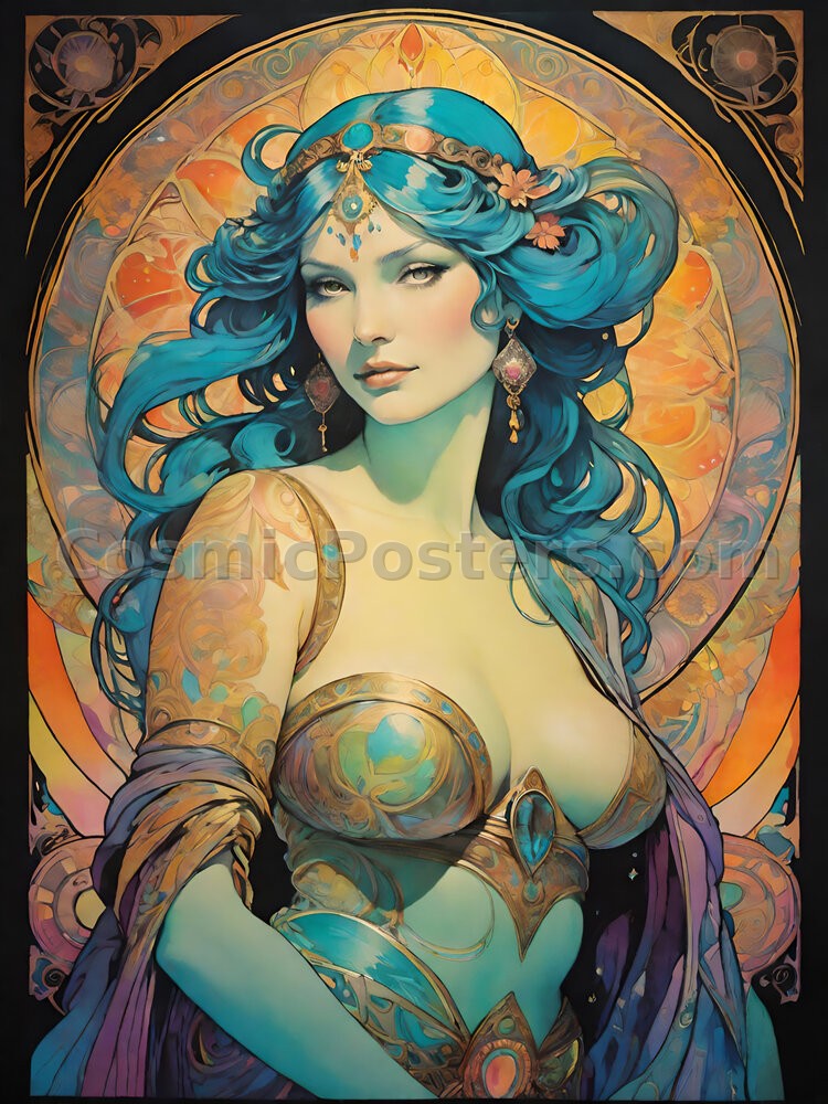Step into the enchanting world of Gilded Reverie 23, where elegance meets a dreamlike fantasy. This exquisite digital art piece draws inspiration from the Art Nouveau movement, characterized by its flowing lines and ornamental details. A striking figure with vibrant turquoise hair gazes serenely from the canvas, her presence both commanding and ethereal. Her attire is a blend of intricate patterns and shimmering gold accents, each detail meticulously crafted to evoke a sense of timeless beauty.