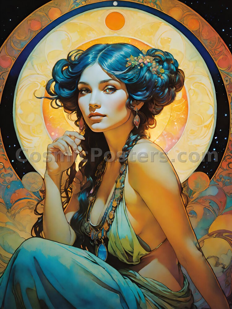 The intricate details of her adornments, from delicate floral accents to shimmering jewels, are reminiscent of the Art Nouveau movement, blending organic forms with ornamental flourishes. The background, a cosmic tapestry of swirling patterns and celestial motifs, enhances the otherworldly ambiance, making it a perfect focal point for any room.