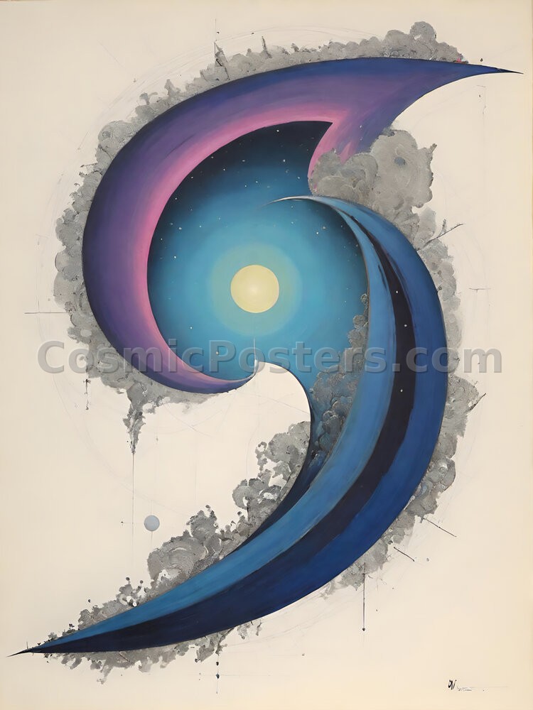 Dive into the cosmic elegance of Kinetic Flow 75, where each curve and color invites contemplation and wonder. This artwork features sweeping arcs of deep blue and purple, swirling around a central orb like a celestial dance. The interplay of shadow and light creates a sense of depth, as if the viewer is peering into the heart of a nebula.