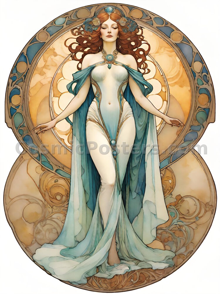 The figure’s auburn curls and delicate adornments reflect the ornate sophistication typical of Art Nouveau, reminiscent of the works of Alphonse Mucha. The soft color palette of blues and warm earth tones creates a harmonious balance, making it a versatile addition to any decor style. Whether you’re drawn to its romantic allure or its detailed craftsmanship, this piece is designed to inspire and calm.