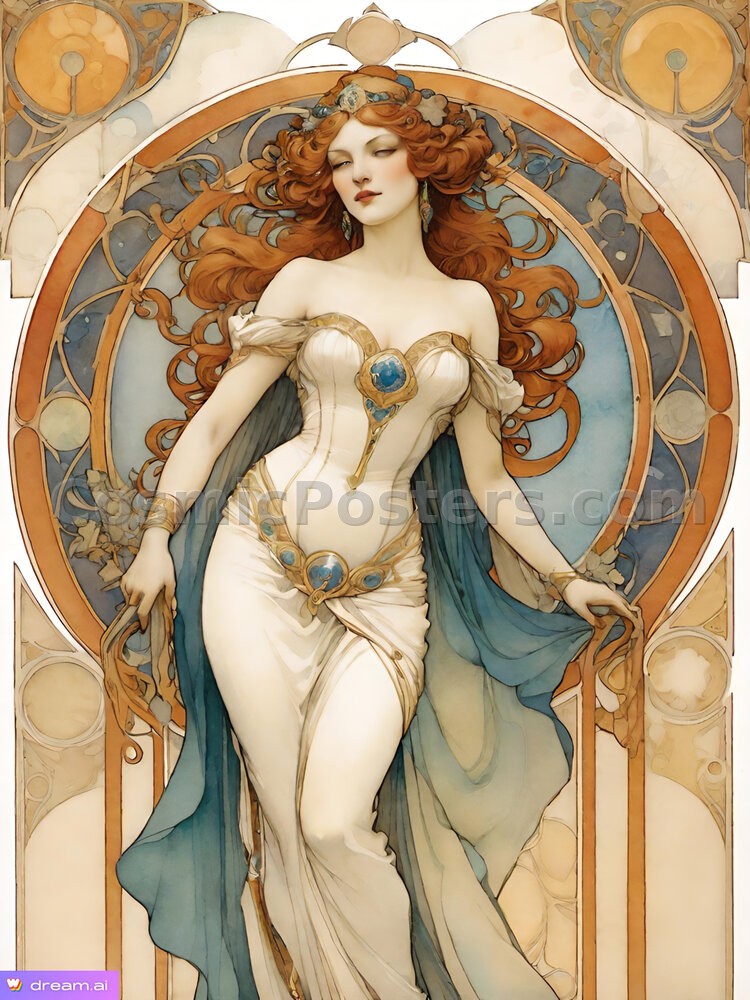 FULL**: Immerse yourself in the timeless beauty of Nouveau Muse 10, a captivating digital artwork that echoes the rich tradition of Art Nouveau. The piece features an ethereal figure adorned in flowing drapery, her presence both serene and commanding. Soft, muted tones of blue, gold, and ivory create a harmonious palette that calms and captivates. The intricate patterns and graceful curves draw inspiration from the iconic elegance of early 20th-century design, making it a perfect addition to any sophisticated setting.