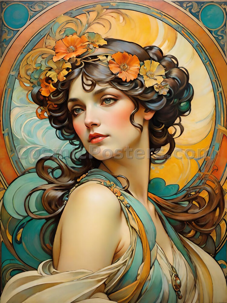 Step into a world of elegance and timeless beauty with Nouveau Muse 32. This stunning digital artwork invites you into the graceful realm of Art Nouveau with a captivating portrait of a muse. Her soft, contemplative gaze is framed by cascading curls and vibrant orange blossoms, evoking a sense of gentle allure and classic sophistication.