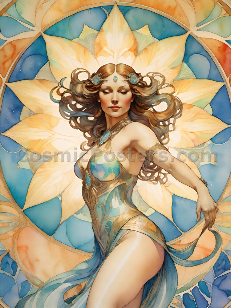 Nouveau Muse 39 invites you into a world where Art Nouveau meets celestial fantasy. This digital artwork features a graceful muse enveloped in a radiant aura of golden and azure tones. Her flowing hair and intricate gown echo the delicate linework and elegance of the Art Nouveau movement, drawing you into her serene, otherworldly realm.
