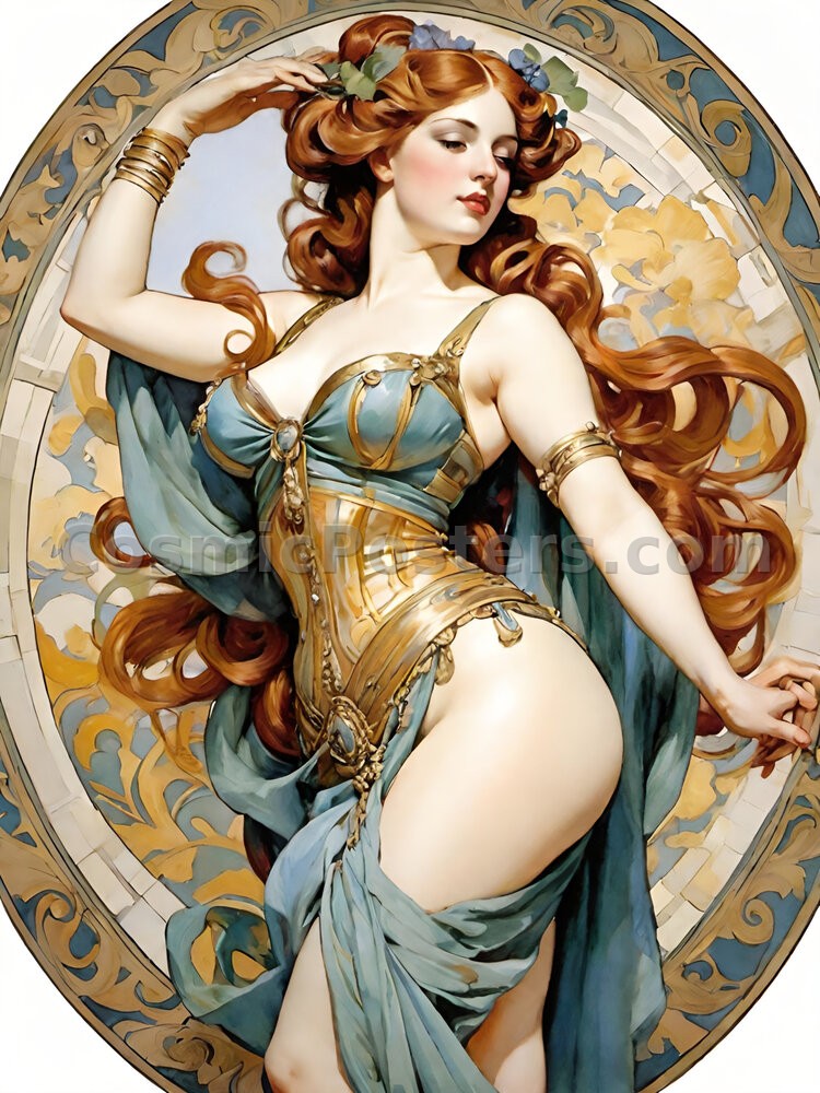 The composition is a dance of curves and delicate linework, reminiscent of the iconic styles of Alphonse Mucha. The warm, earthy tones of her hair and the cool, serene blues of her drapery create a harmonious contrast, making it an ideal focal point for any room. Whether in a cozy reading nook, a chic home office, or a stylish studio, this piece brings a touch of vintage sophistication and tranquility.