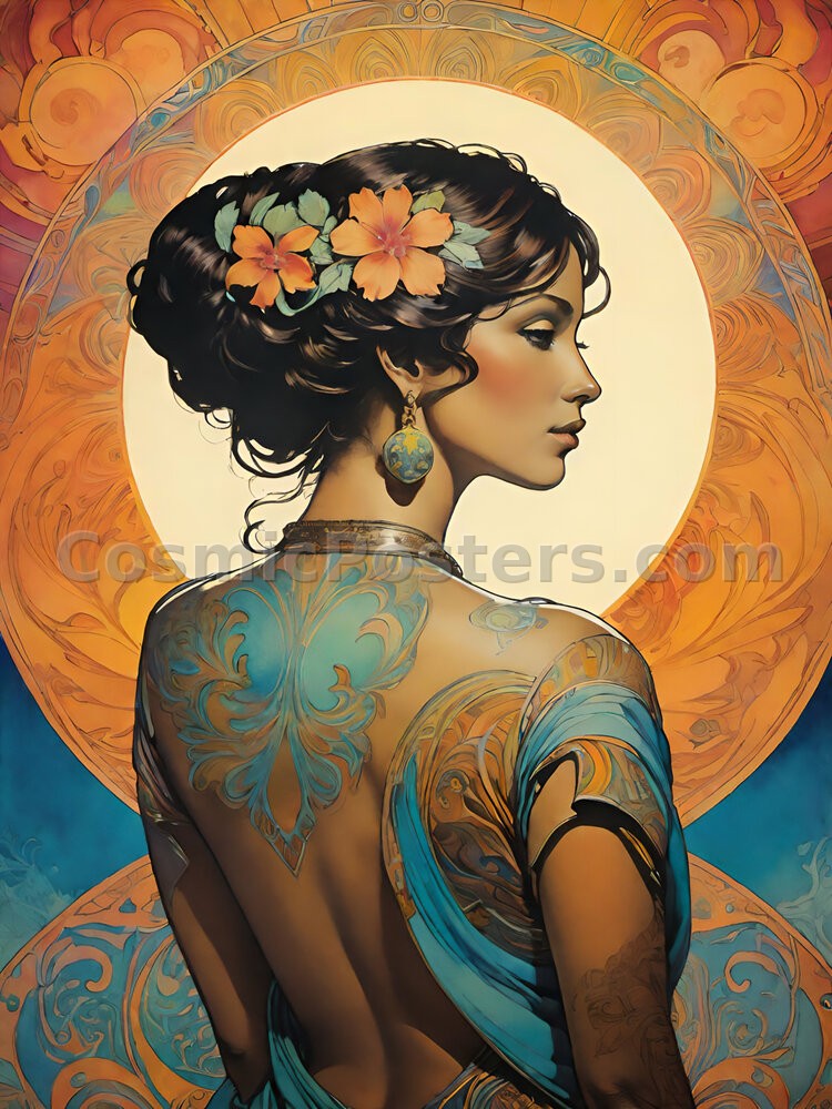 Immerse yourself in the enchanting allure of Nouveau Muse 41, a digital artwork that harmoniously blends Art Nouveau elegance with modern sensibility. The graceful portrait captures a poised muse adorned with vibrant blossoms nestled in her dark, flowing hair. Her gentle expression is framed by intricate patterns of teal and orange, evoking a sense of serene sophistication.