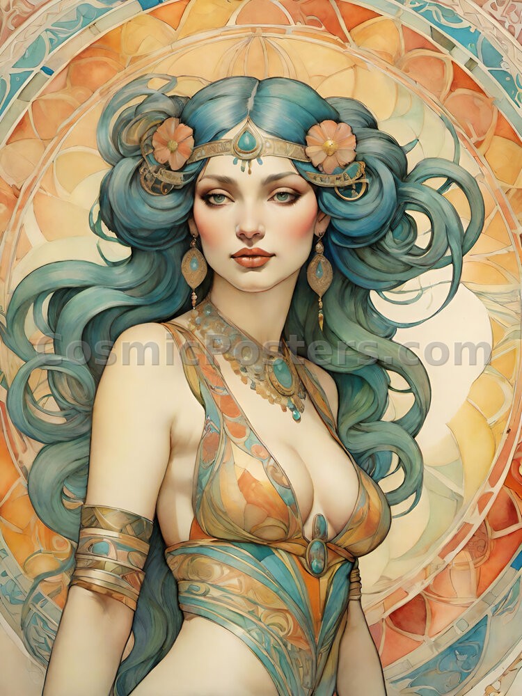 Nouveau Muse 44 is a striking digital artwork that invites you into a world of elegance and timeless beauty. This piece captures the essence of Art Nouveau with its flowing curves, intricate details, and a harmonious blend of colors. The muse’s turquoise hair cascades in waves, adorned with delicate flowers and jewelry that shimmer with hints of gold and copper. Her serene expression and graceful posture evoke a sense of calm and poise.