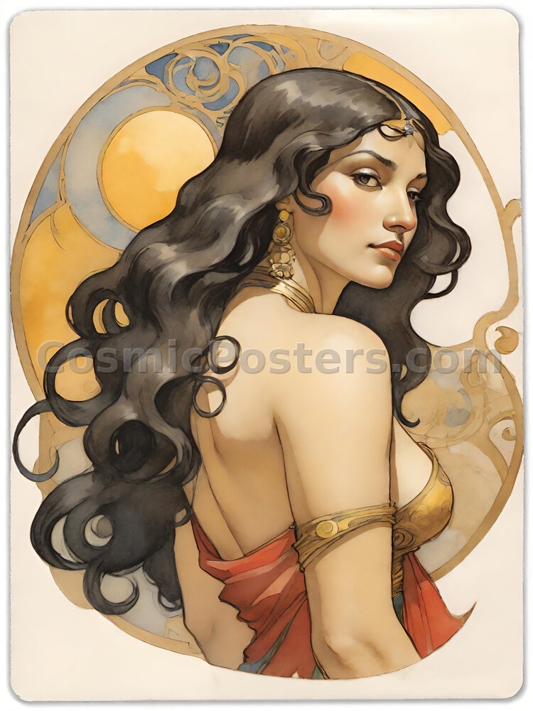Elevate your living space with Nouveau Muse 46, a digital art print that embodies the elegance and intricate beauty of Art Nouveau. This piece features a captivating figure with cascading dark hair and a serene expression, enhanced by rich amber and sienna tones. The background is a harmonious blend of soft, swirling patterns that provide depth and movement, reminiscent of classic Nouveau designs.