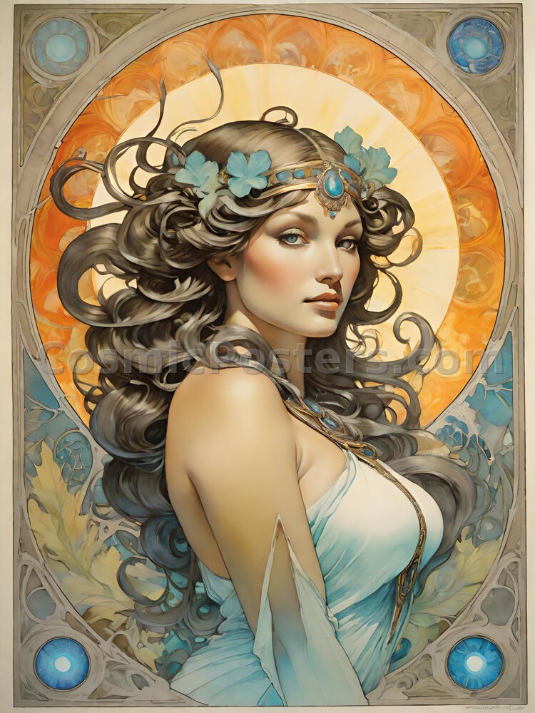 Step into a world of timeless elegance with Nouveau Muse 46, where the enchanting allure of Art Nouveau comes to life. This digital artwork features a graceful muse adorned with intricate floral details and a captivating halo of warm, golden hues. Her cascading hair and serene expression evoke a sense of calm and beauty, making it an ideal centerpiece for any room.