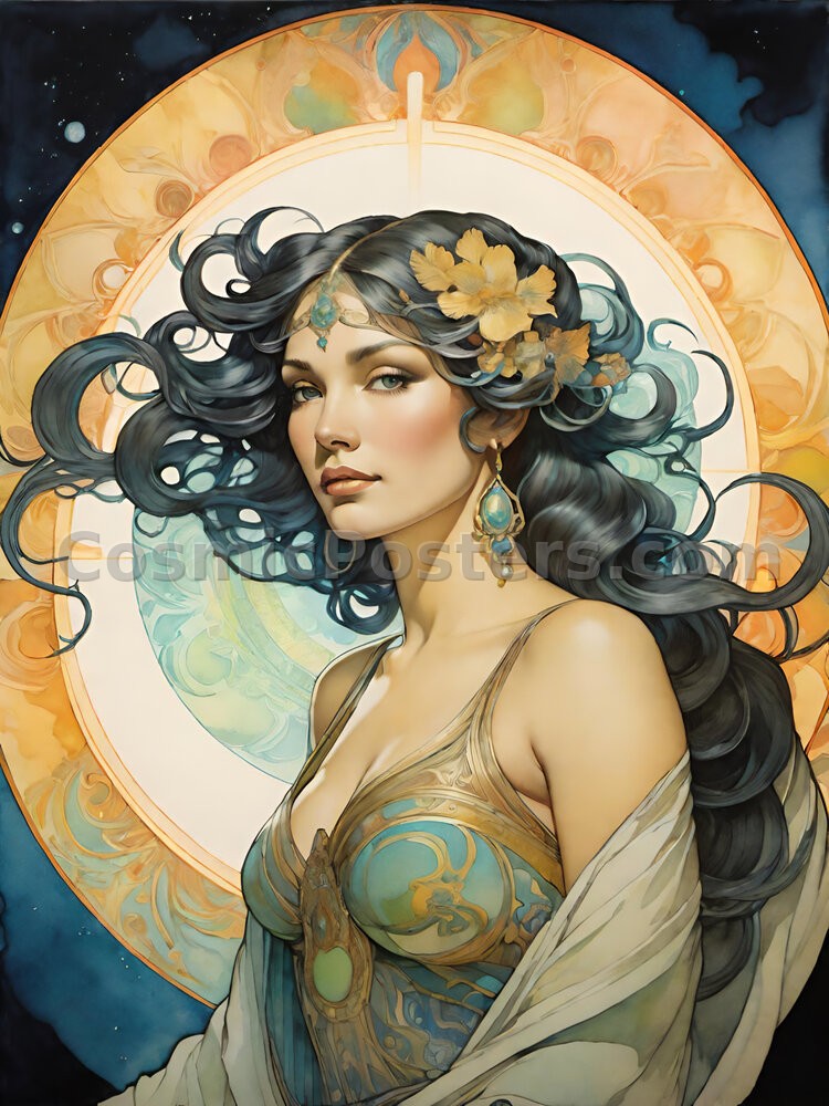 Step into a world of elegance and enchantment with Nouveau Muse 48. This stunning digital art print embodies the graceful curves and intricate details of the Art Nouveau movement, reimagined with a modern flair. The muse, with her flowing dark hair and gentle expression, is framed by a halo of delicate florals and ornate designs in hues of gold and teal. Her gaze is serene, inviting a sense of calm and introspection.