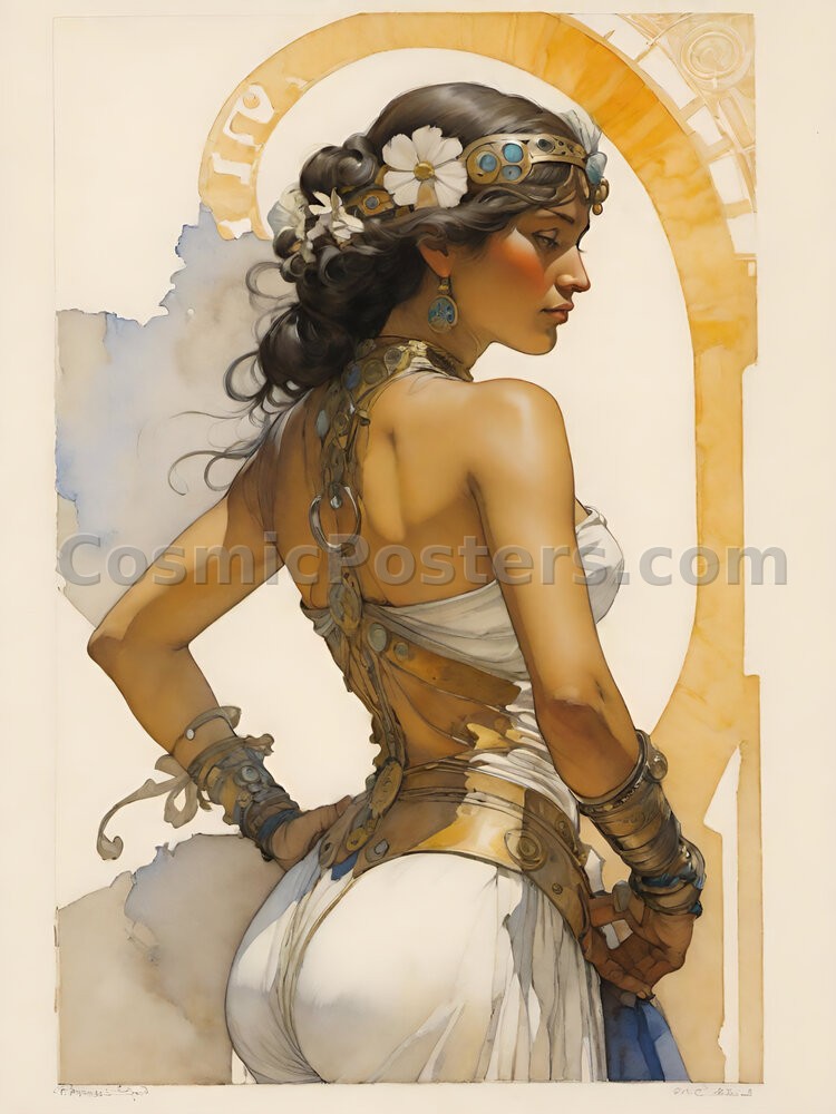 “Nouveau Muse 50” invites you into a world of elegance and timeless beauty. This striking digital artwork features a poised muse, her serene expression framed by cascading dark curls adorned with delicate flowers and ornate jewelry. The soft, earthy tones of her attire blend seamlessly with the intricate gold and blue accents, creating a harmonious balance that feels both classic and modern.