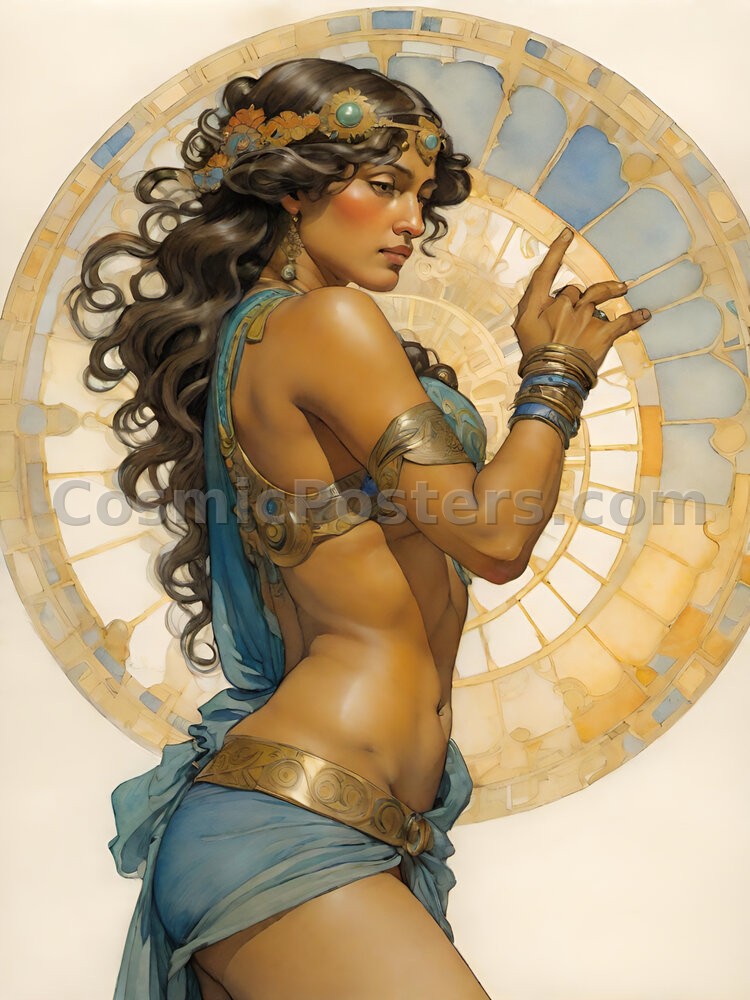 Nouveau Muse 57 invites you into a world where classic elegance meets contemporary flair. This digital art piece captures the essence of Art Nouveau through its sinuous lines and intricate detailing. A poised figure, draped in luxurious, blue-hued fabric, stands gracefully, her presence enhanced by an ornate background that swirls with geometric precision. The muted tones of gold and blue blend seamlessly, creating a serene yet inspiring atmosphere.