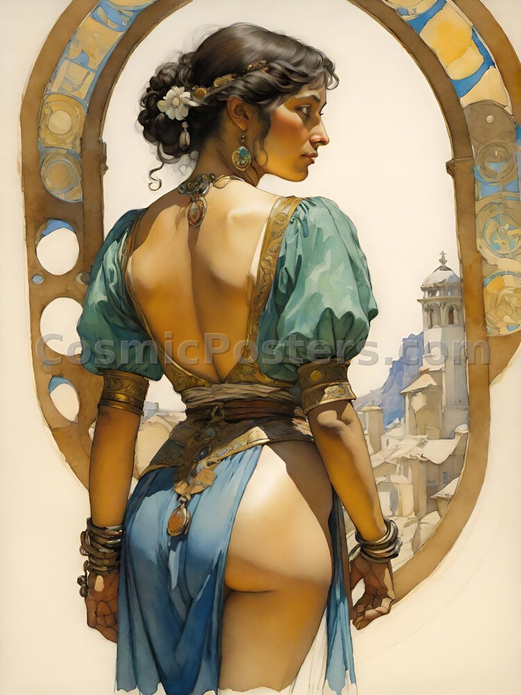 Step into a world where elegance meets timeless art with Nouveau Muse 59. This digital artwork transports you back to a realm of classic beauty, merging the fluid grace of Art Nouveau with the warmth of Mediterranean influences. The portrait of a poised figure, adorned in a flowing, sea-green garment, is beautifully framed by ornate arches that echo the soft curves and intricate details of the era. Her thoughtful gaze over a distant, sunlit cityscape evokes a sense of mystique and nostalgia, inviting viewers to explore stories untold.