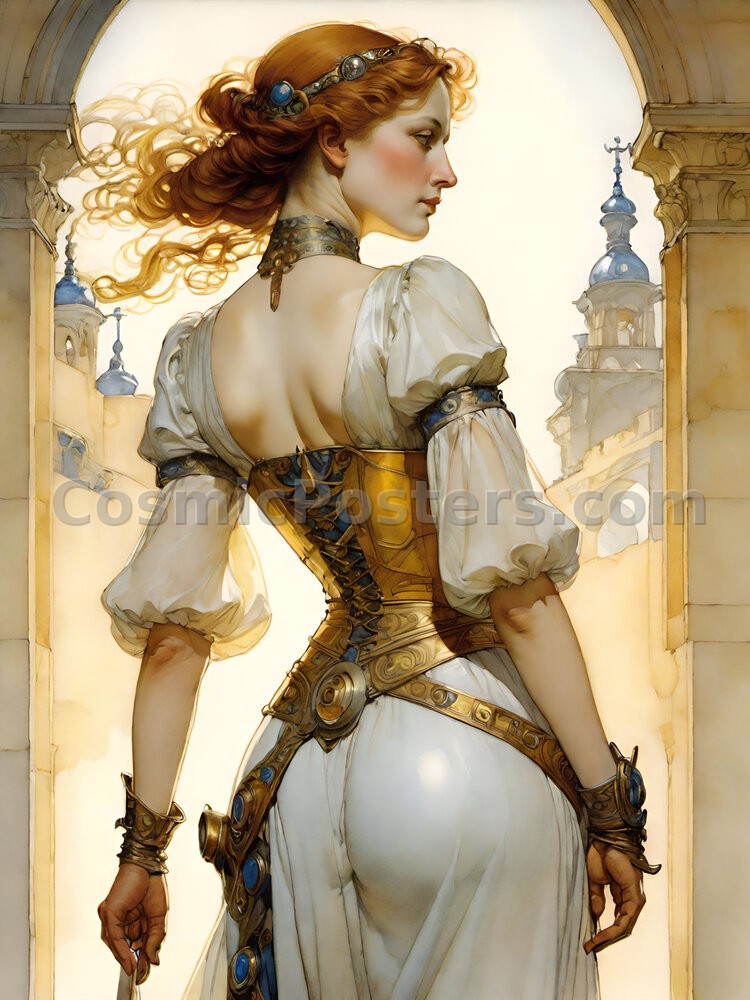 Step into a world of elegance with Nouveau Muse 63, a captivating digital artwork that channels the grace and sophistication of Art Nouveau. The piece showcases a striking portrait of a woman, her auburn hair cascading in gentle waves, adorned with exquisite gold and sapphire jewelry. Her gaze, serene and introspective, is set against a backdrop of intricate architectural elements, evoking a sense of timeless beauty and quiet strength.