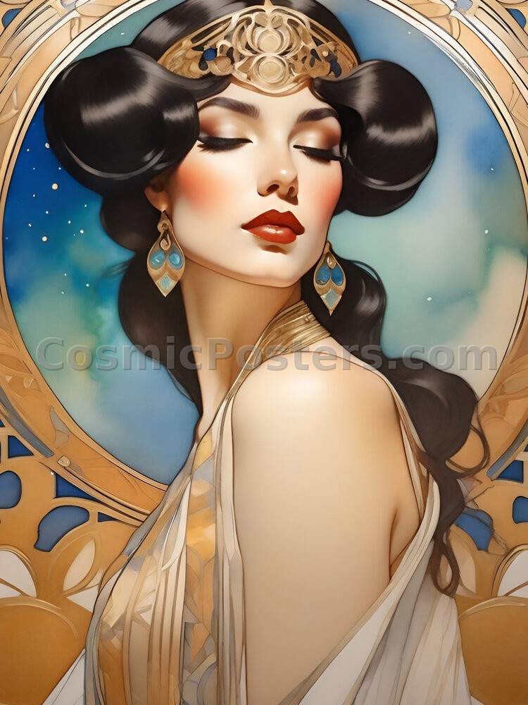 The backdrop is a soft, swirling mix of deep blues and gentle golds, creating a celestial atmosphere that enhances the artwork’s ethereal quality. Inspired by Art Nouveau with its characteristic flowing lines and intricate details, this piece captures the spirit of beauty and harmony.
