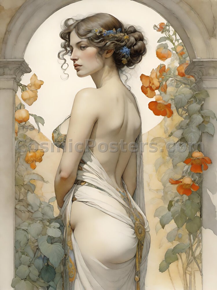 Discover a world of elegance with Nouveau Muse 78, a digital artwork that captures the essence of Art Nouveau’s flowing grace. This piece features a serene figure enveloped in delicate drapery, standing under a classical archway that frames her with an air of timeless beauty. Her hair is adorned with soft blossoms, while vibrant orange and green hues provide a gentle contrast, inviting warmth and tranquility into any space.