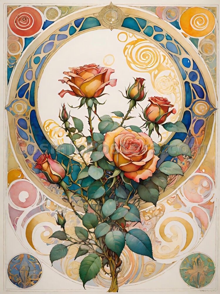 Immerse yourself in the timeless beauty of Watercolor Rose 36, where the classic elegance of Art Nouveau meets the vivid allure of botanical art. This digital artwork presents a bouquet of roses in rich hues of apricot and blush, their petals tenderly unfolding against a backdrop of intricate, swirling designs. The harmonious blend of colors and patterns creates an atmosphere of warmth and sophistication, making it an ideal addition to any setting seeking a touch of nature-inspired grace.