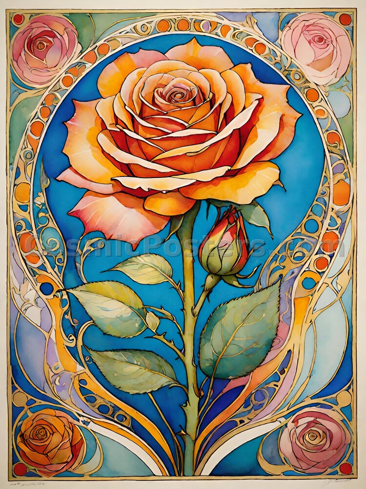 Immerse yourself in the timeless charm of Watercolor Rose 42, where Art Nouveau intricacy meets vibrant color. The central rose bursts with shades of orange and red, each petal meticulously detailed against a stunning blue background. Surrounding it, ornate flowing lines weave a tapestry of elegance, embracing the bloom with a sense of movement and grace.