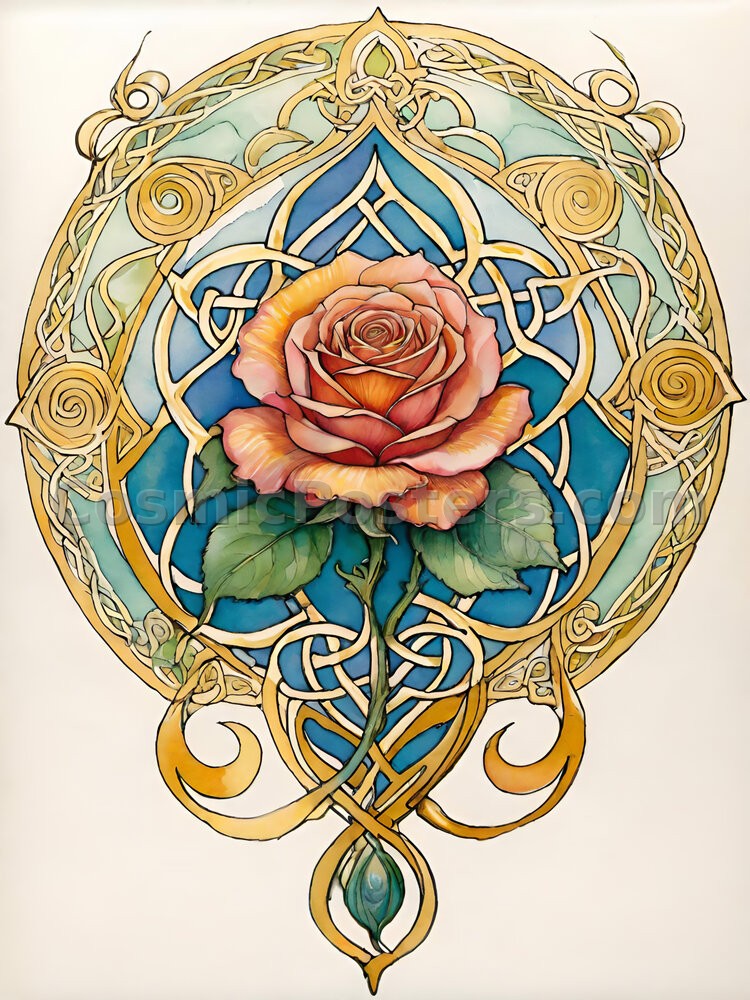 “Watercolor Rose 51” is a stunning digital art piece that marries the intricate beauty of Celtic design with the natural grace of a rose in full bloom. The artwork features a vibrant rose at its heart, enveloped by intricate golden Celtic patterns that evoke a sense of history and mysticism. The deep blues and greens weave through the composition, adding depth and contrast to the warm, earthy tones of the rose.