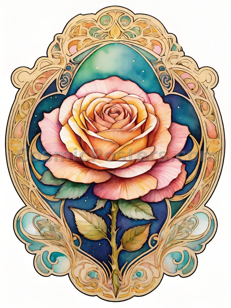 Watercolor Rose 55 draws you into a world of vibrant elegance, where Art Nouveau meets the fluid beauty of watercolor. The centerpiece is a stunning rose, its petals painted in warm hues of blush, apricot, and honey, framed by intricate golden linework. The background is a mesmerizing mix of deep blues and soft greens, creating an aura of depth and serenity.