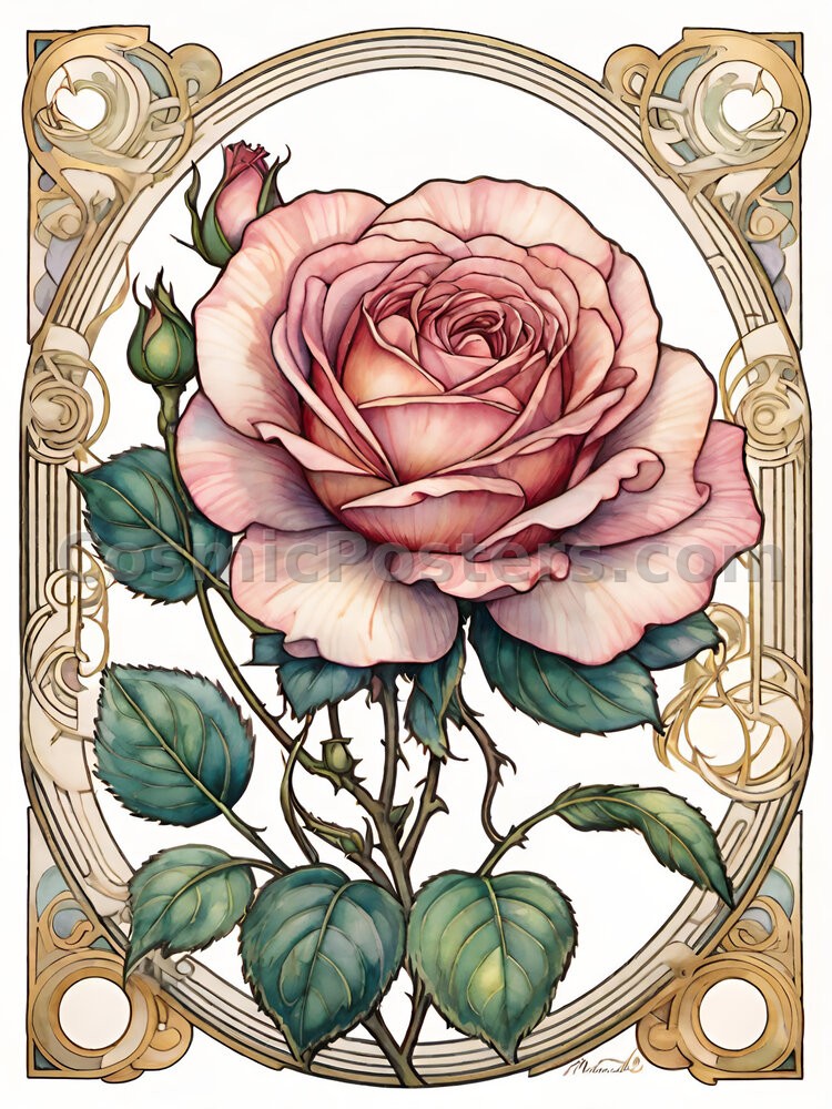 Step into a world where vintage elegance meets modern design with Watercolor Rose 65. This stunning digital artwork features a delicately painted rose in gentle hues of pink, perfectly complemented by lush green leaves. Encased in intricate, swirling gold frames, the piece radiates a sophisticated Art Nouveau charm that transports you to an era of refined beauty and artistic excellence. The ornate details and color palette create a symphony of serenity and grace, making it ideal for spaces that seek a touch of timeless sophistication.